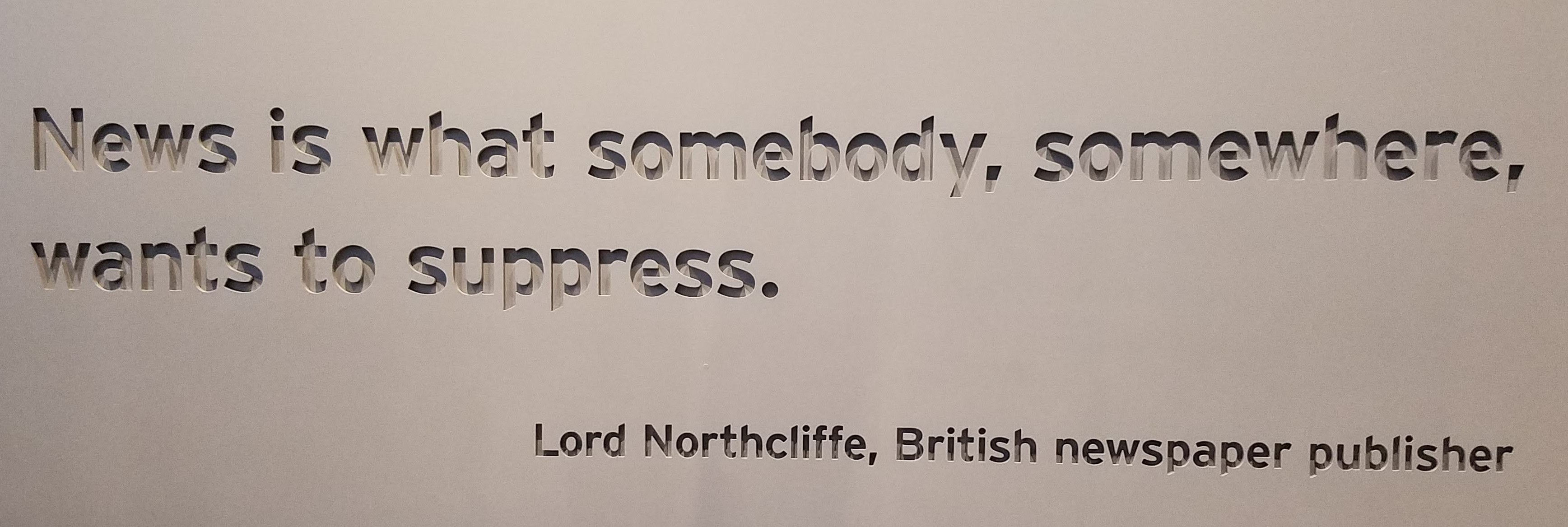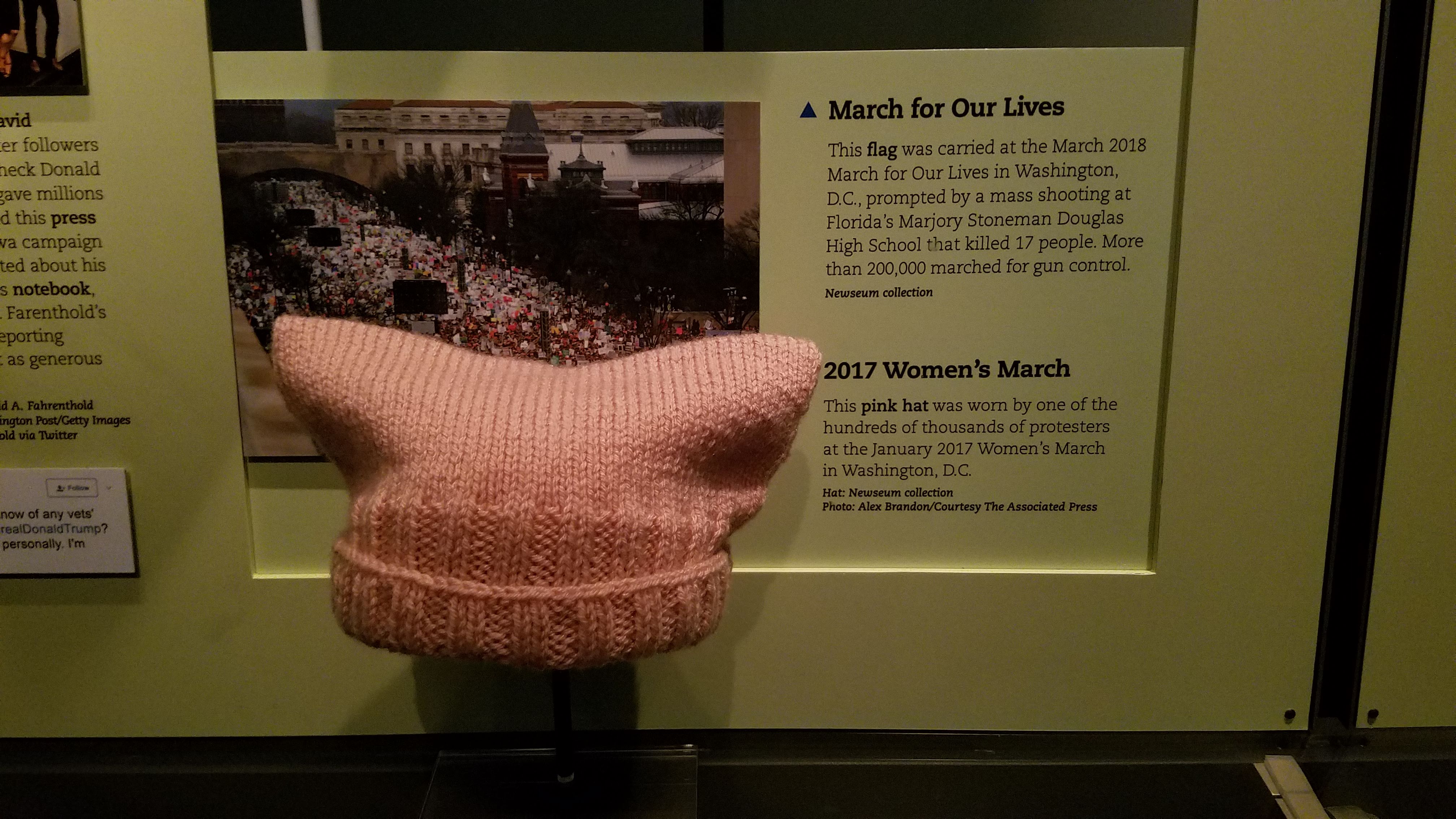 One wonderful part of the visit was finding a pink “pussy” hat in a more recent exhibit featuring new protest movements. Other objects around it included a sign from “March For Our Lives” and a Black Lives Matter t-shirt. It was interesting to me that the Newseum label describes the hat as a “pink hat,” rather than a “pussy hat,” which I think it the more widely used descriptor. Group 1 will be examining this decision a bit as we put together our project.